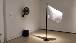 Parley is a data-driven sound and sculpture installation addressing the growing cultural and political divisions in the United States. The installation consists of a white flag, the international symbol of truce and negotiation, flying on a fabricated wooden flagpole with a soundscape based on the sonification of twitter mentions of the phrase “Civil War”. A wall mounted fan keeps the flag aloft and contributes white noise from which the soundscape emerges.